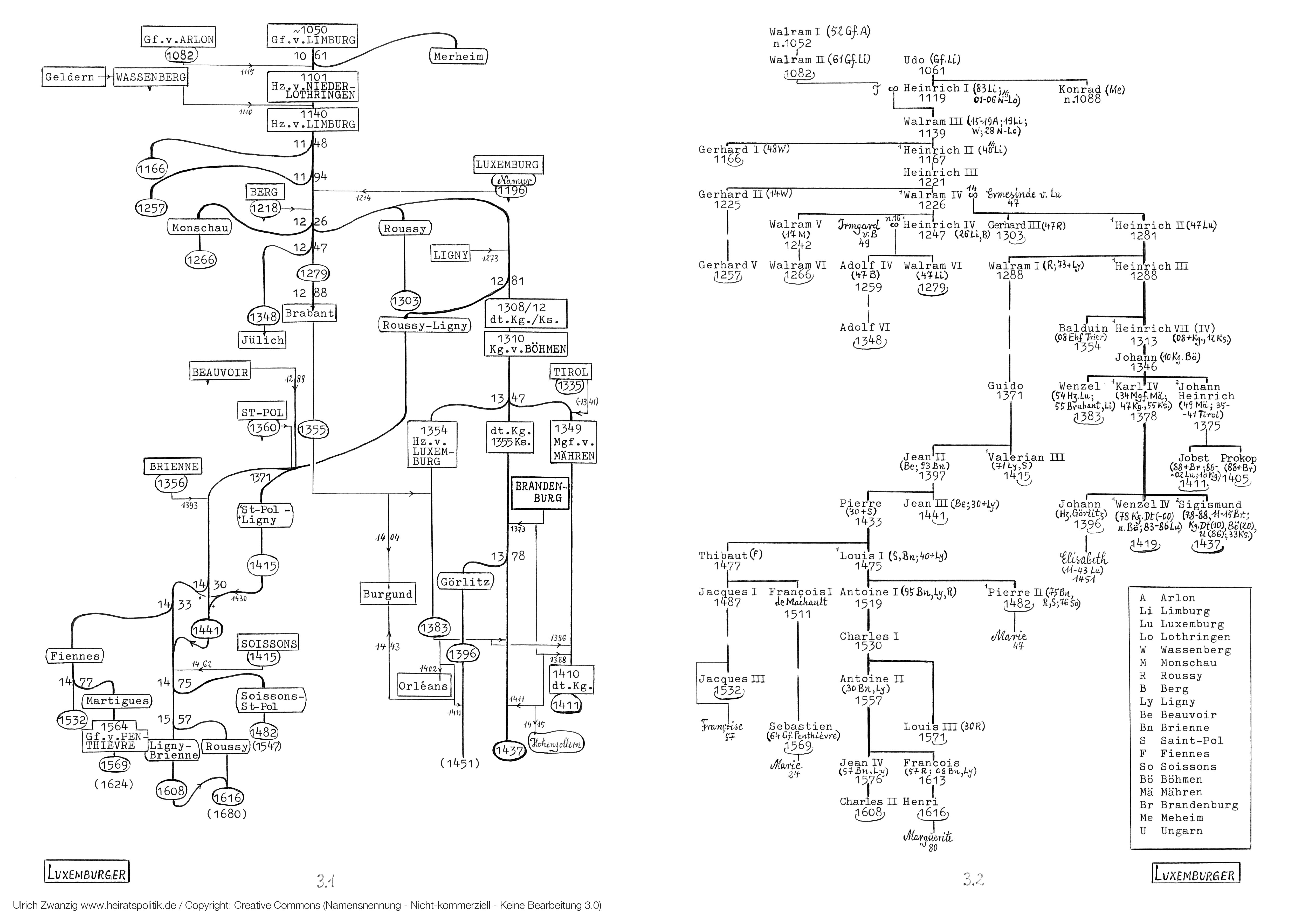 Die korrekte Bezeichnung der (neuen) Luxemburger hätte vielmehr, nach den beiden Grafschaften, deren Fusion 1115 sie ursprünglich ihren zunehmenden Einfluß verdankten, Limburg-Arlon zu lauten. Aber wichtiger als das Limburger Hzm., das sie 1288 durch die Schlacht bei Worringen ans Hzm. Brabant verloren, wurde für sie eben die Gft. Luxemburg, der seit 1226 ein eigener Zweig zuwuchs: Ihn eröffnete Heinrich II, Großvater Heinrichs VII, des ersten luxemburgischen Kaisers († 1313).