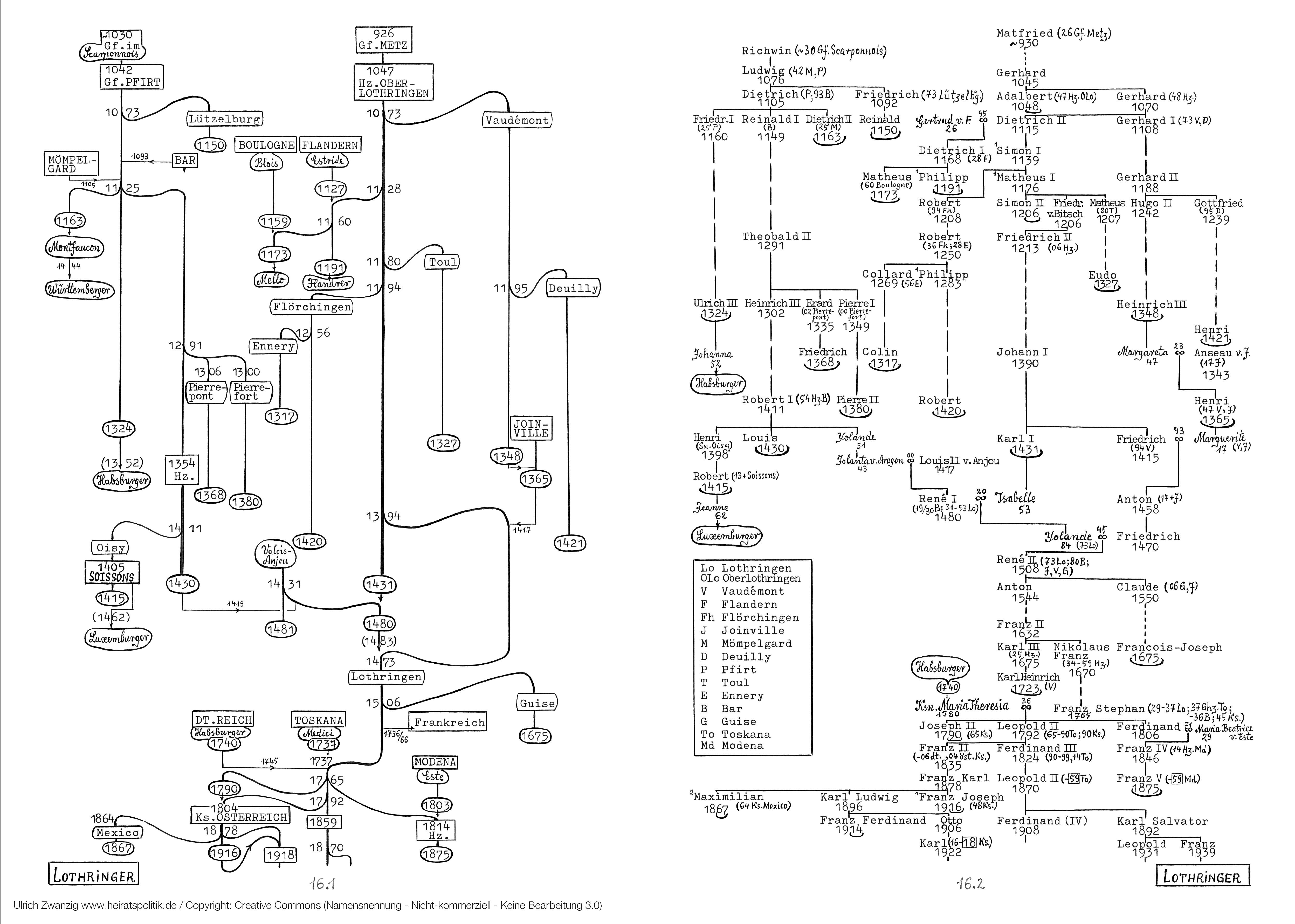 Die Darstellung 16.1-2 unterscheidet sich von den übrigen dadurch, daß sie den Werdegang nicht einer, sondern zweier Dynastien wiedergibt: der Matfriedinger, die im Hzm. Lothringen, und der Scarponnois, die im Hzm. Bar regierten. Denn Lothringen und Bar waren Geschwisterländer, vergleichbar Holstein (Schaumburger) und Schleswig (Oldenburger). Die Familie Bar endete 1430, die Familie Lothringen hat bis heute überlebt. Wenn man von den heutigen Habsburgern redet, so sind vielmehr Lothringer gemeint; denn der letzte Habsburger, Ks. Karl VI, starb 1740, und sein Schwiegersohn, Hz. Franz v. Lothringen, Gatte Ksn. Maria Theresias, führte das Haus fort.