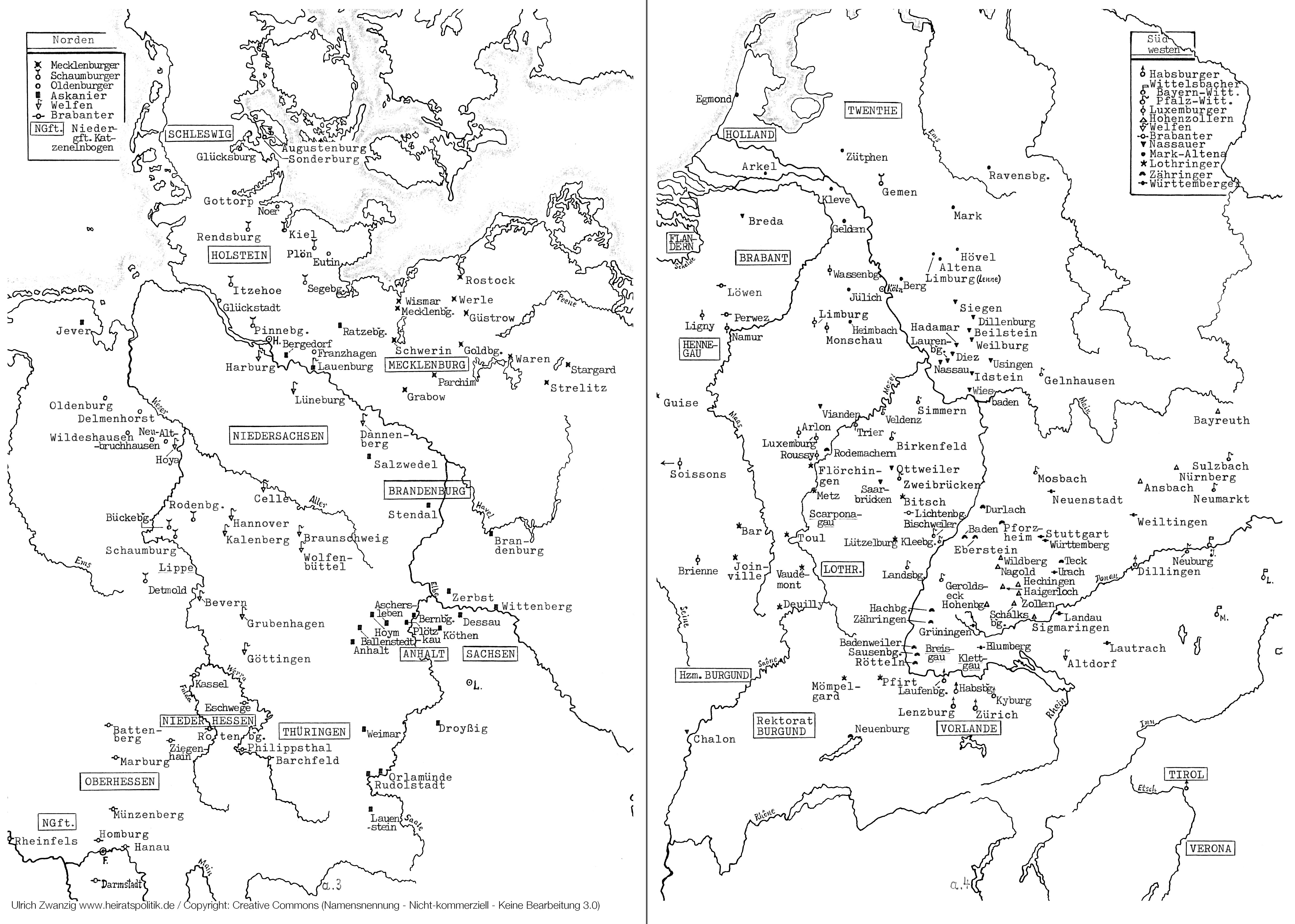 a.3-4 zeigt die Lage einiger Landschaften und Orte, die in den Stammtafeln und Liniendiagrammen erwähnt werden, und zwar (von Nord nach Süd und von links nach rechts)